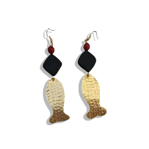 Découvrez nos boucles d’oreilles artisanales au motif de poisson, un bijou authentique qui marie tradition et modernité. Ces boucles d’oreilles uniques se distinguent par leur design raffiné : un pendentif en métal doré martelé en forme de poisson, accompagné de perles aux tons noirs et rouges.