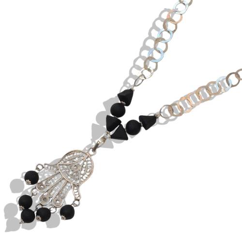 Ce collier traditionnel tunisien, orné d’une khomssa emblématique, incarne un savoir-faire artisanal exceptionnel et une riche symbolique culturelle. La khomssa, symbole universel de protection et de chance, est finement travaillée avec des motifs gravés et parfois rehaussée de pierres semi-précieuses pour un éclat unique. Fabriqué à la main avec des matériaux nobles tels que l’argent ou l’or, ce collier se distingue par ses détails minutieux et son élégance intemporelle. Conçu pour allier robustesse et raffinement, il s’inscrit dans une tradition séculaire tout en s’adaptant parfaitement aux goûts modernes, faisant de cette pièce un bijou unique et précieux.